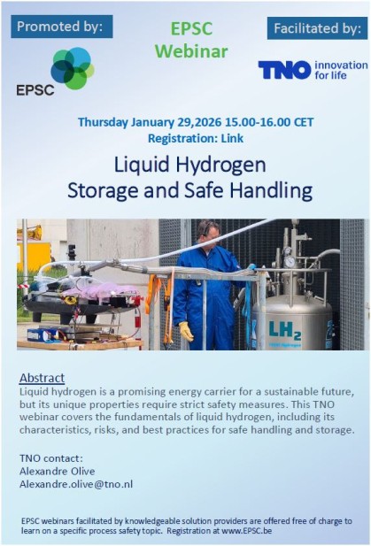 Join us for the EPSC Webinar: Liquid Hydrogen Storage and Safe Handling hosted by the European Process Safety Centre and presented by John Zevenbergen (TNO). The webinar will take place on 29 January 2026 at 15:00 CET.